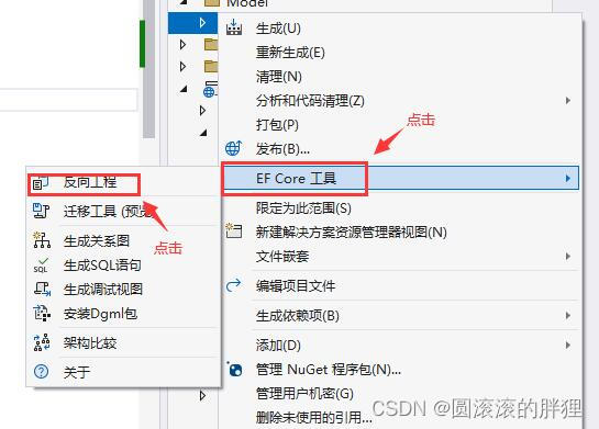 首先在model项目上点右键,在出现的菜单上点击EF Core工具,再点击反向工程