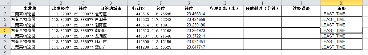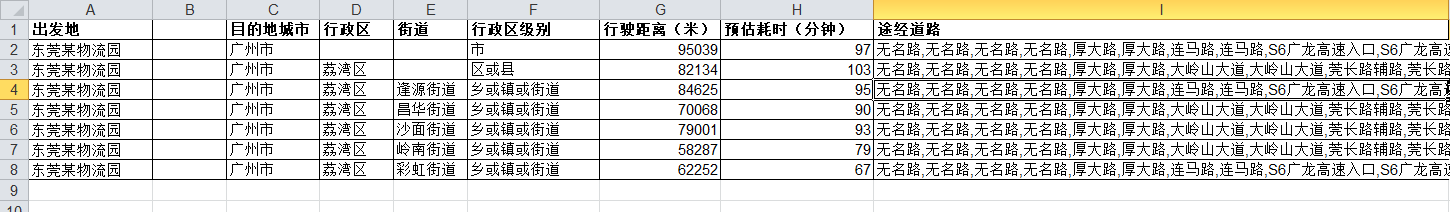 表中信息包括:出发地、目的地的经纬度坐标,两地间行车距离、预估耗时、途经道路名称等信息。