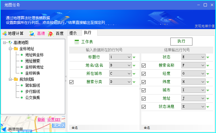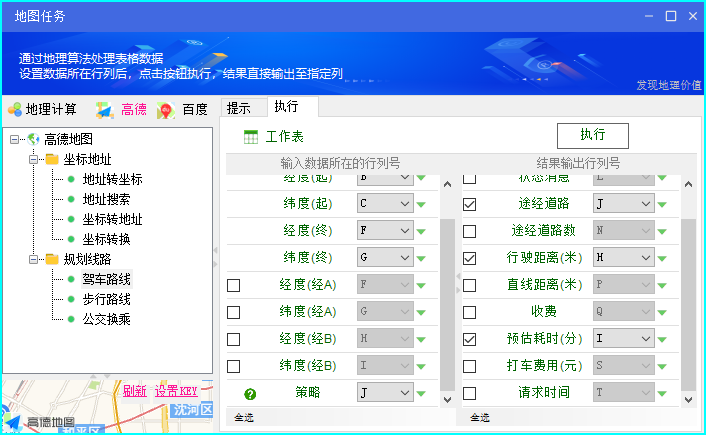 接下来,使用【地理工具 / 路径规划】 功能,计算表格中出发坐标--目的地坐标 之间的驾车距离、耗时等信息。