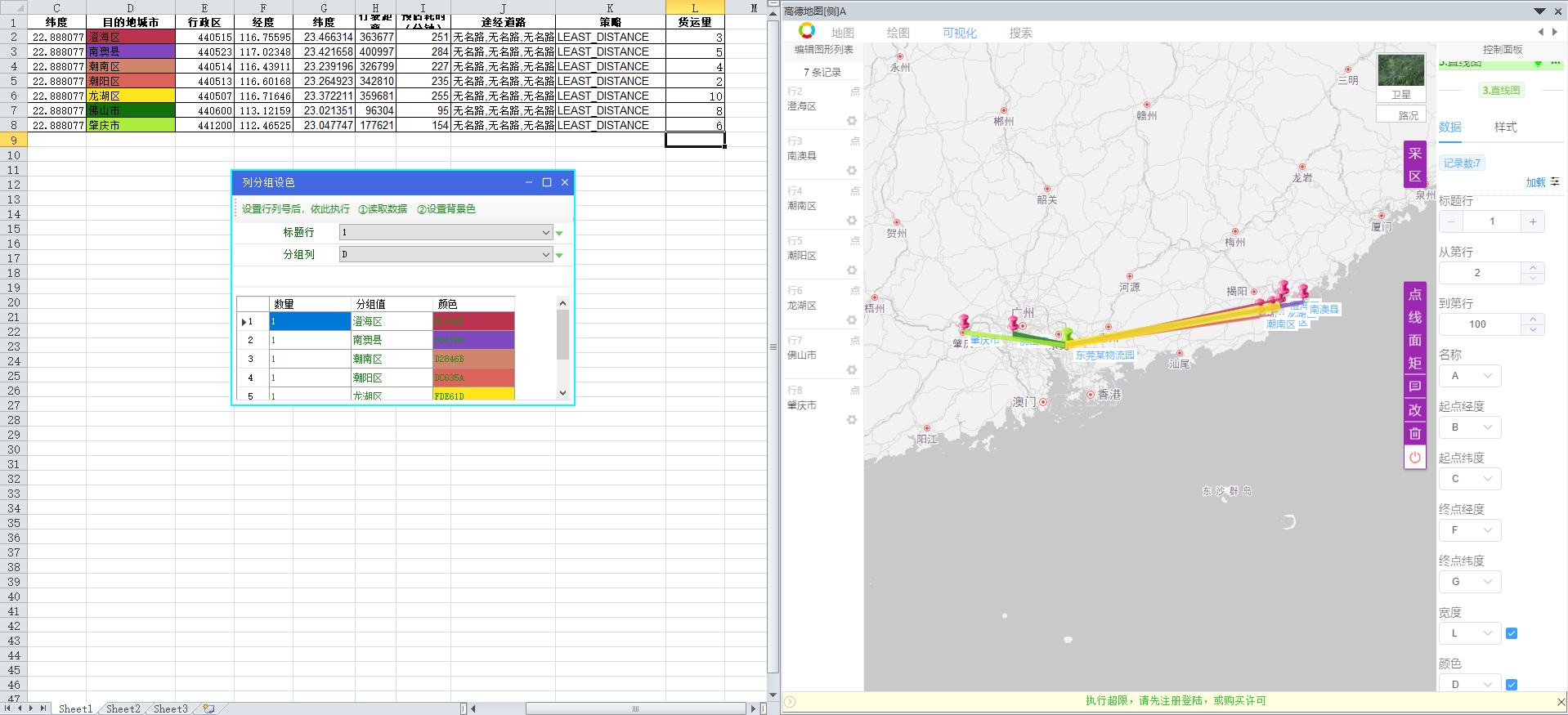 然后,使用【地图可视化】创建【直线图】,选择出发地、目的地的经纬度所在列号,点击【加载】后,地图上将依据数据创建出发地至目的地间的直线,颜色按单元格背景色,线段粗细按设置的【货运量】值。