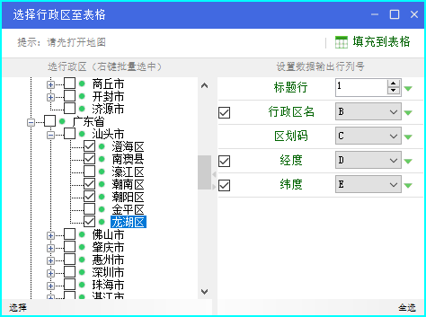 支持选择 省 / 市 / 区县 三级,输出数据项包括: 行政区名称、区划码、经度、纬度,此处坐标为该行政区范围的中心坐标。