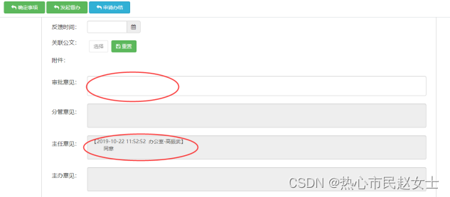 办结审批:办公室主任/主办部门/配合部门/分管领导要填写审批意见,填写的意见可自动识别到对应的意见栏。