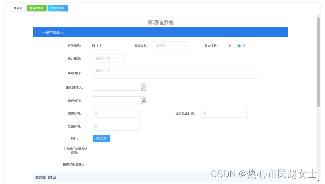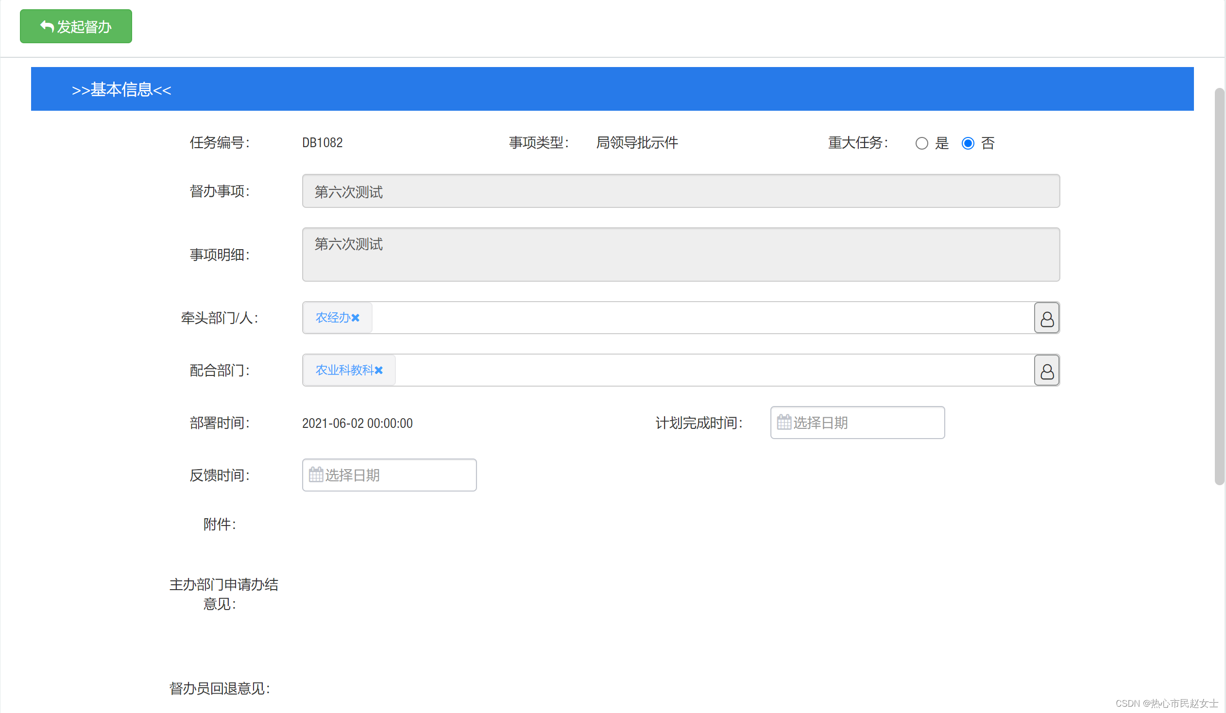 主办部门、配合部门的部门负责人可在待审批的督办事项内进入督办事项详情页面,主办部门在页面上方点击“确认事项”接受督办任务;