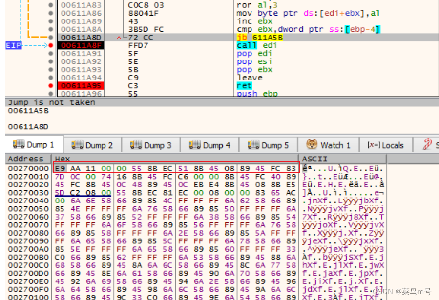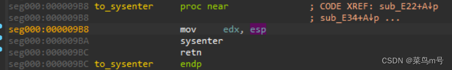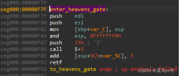 这里会用到一个叫天堂之门的技术,就是让32位程序调用64位的函数,先把要进行系统调用的id先保存到eax中: