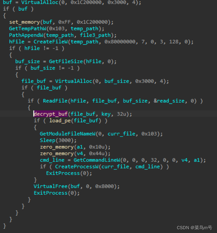 - 从 kernel32.dll 每个函数的名称校验和取出所需函数。CreateFileW、GetTempPathW、lstrcatW、ReadFile、VirtualAlloc、GetTempPathW。
