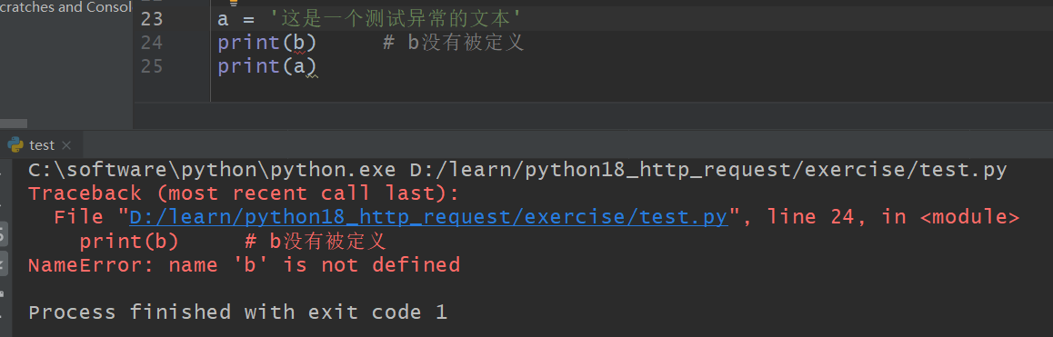 上述例子中因为b没有被定义,在打印时无法找到b,因此抛出了一个NameError导致后面的代码无法继续执行,那么我们来捕获一下这个错误