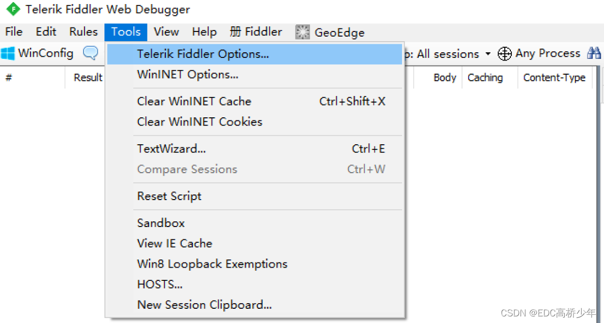 启动Fiddler,打开菜单栏中的 Tools >Options,打开“Fiddler Options”对话框