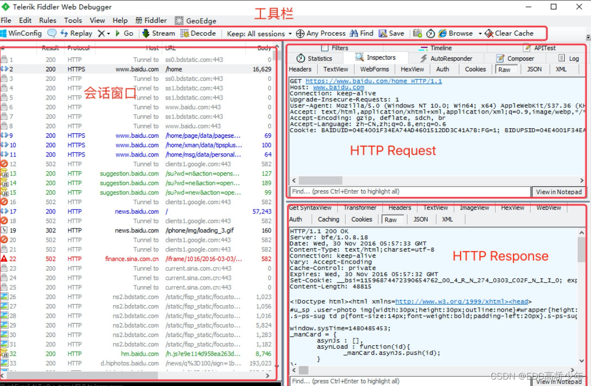 | Headers | 显示客户端发送到服务器的 HTTP 请求的,header 显示为一个分级视图,包含了 Web 客户端信息、Cookie、传输状态等 |