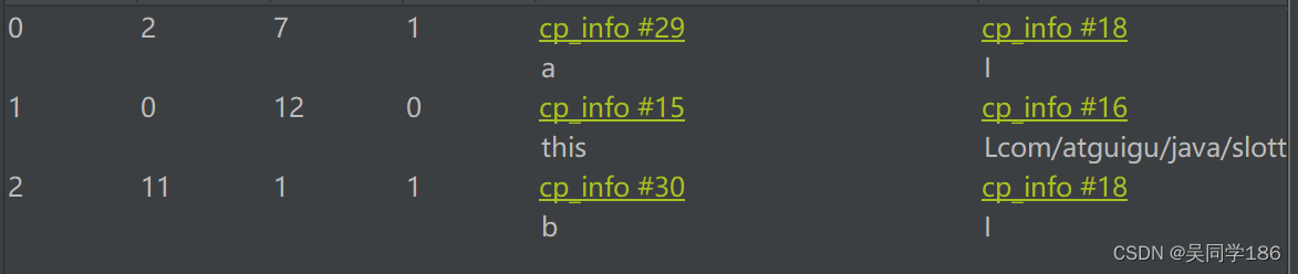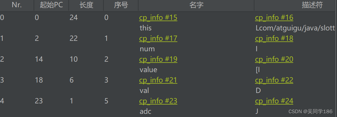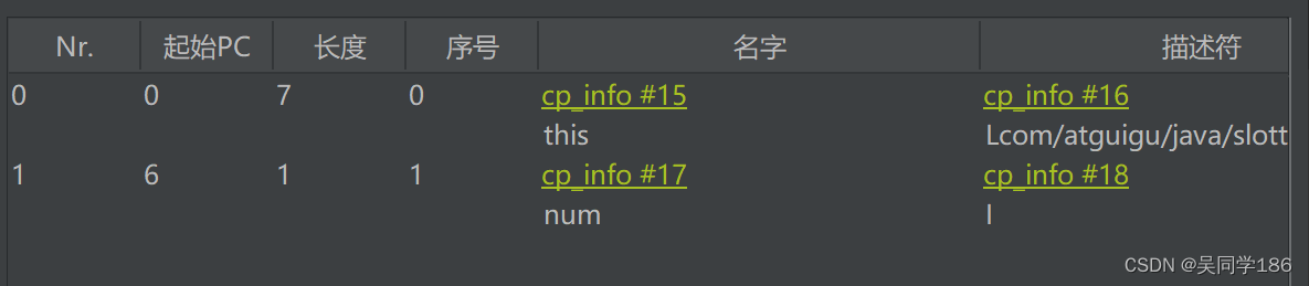 如果当前帧是由构造方法或者实例方法创建的,那么该对象引用this将会存放在index为0的slot处,其余的参数按照参数表顺序继续排列。