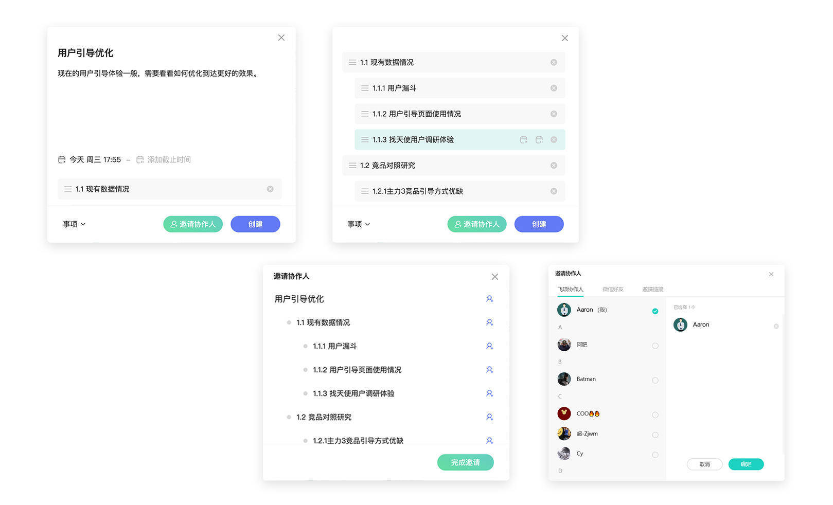 拆解目标、明确执行任务,在飞项构建出多级事项脉络后,我们还可以根据各事项特性及要求邀请相应协作人,组建专属团队。