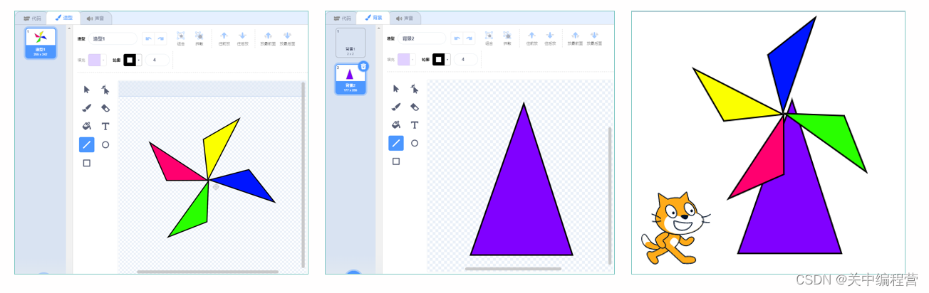 5) 程序中包含切换角色的造型,角色移动和旋转;