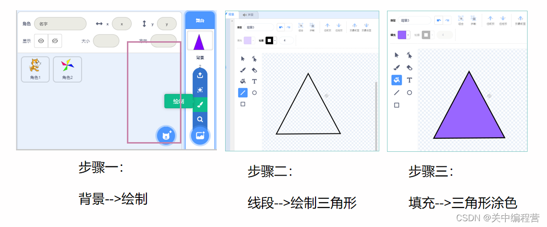 本节课主要要求学生可以掌握简单绘制角色和背景。在scratch中虽然可以绘制出不同的图形,但是基本绘图图形只有3种:线段,圆,正方形。