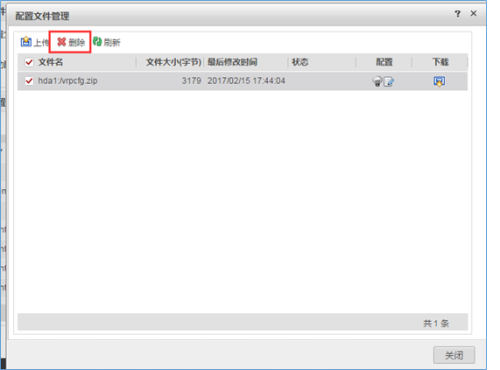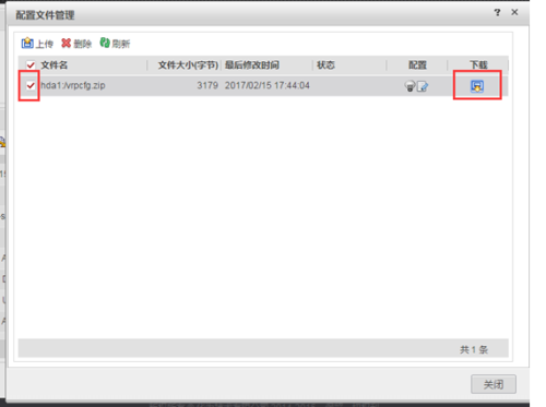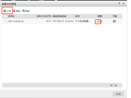 配置修改完成后,我们回到配置界面。我们先将原有的vrpcfg.zip文件给删除掉。然后将我们修改好的配置文件上传上去,并点击小灯泡那个图标,将配置文件设置为下次启动生效。