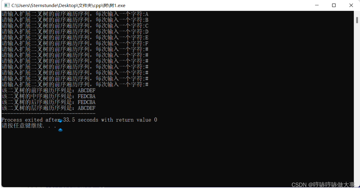 cout << "请输入扩展二叉树的前序遍历序列,每次输入一个字符:";
