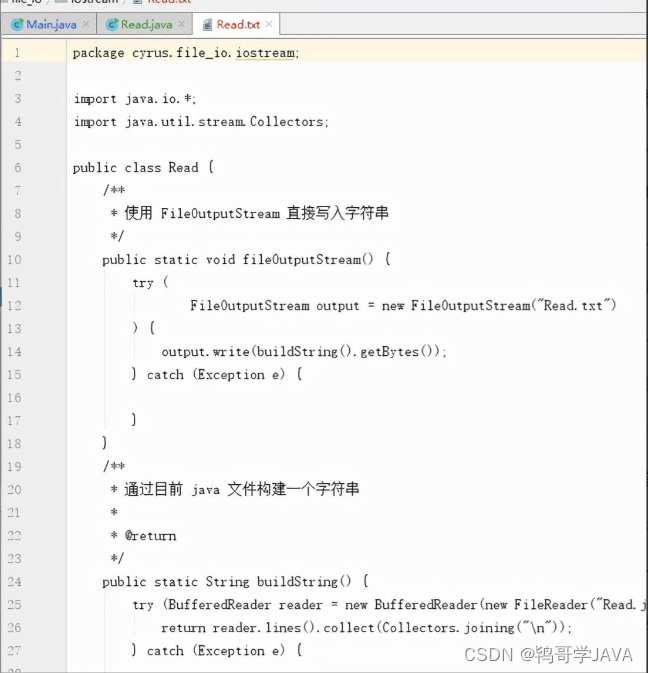 后面就不展示输出了,所有的输出都是输出到当前工作目录的Read.txt文件夹下,并且文件内容都是当前 .java 文件的内容
