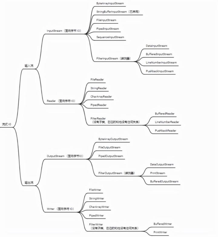 流式IO 其实挺好理解的,一共分为两套,InputStream、OutputStream 为一套,Reader 和 Writer 为一套,其中各自都有基本输入输出类和使用基本输入输出类构造的装饰器输入输出类,装饰器还能构造装饰器,无限套娃。