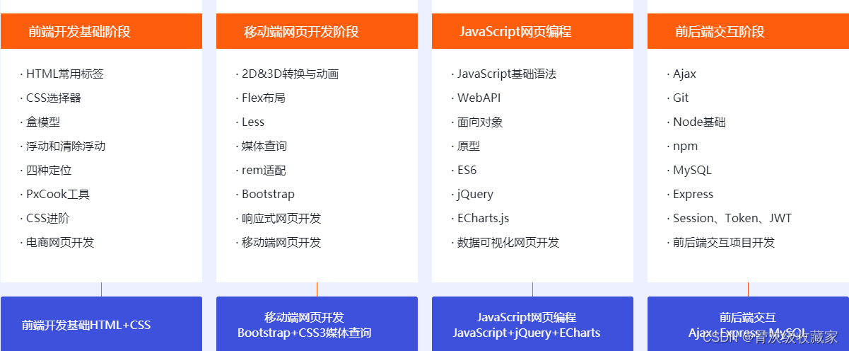 JavaScript阶段: JavaScript基础 → JavaScript核心Web APIs → 数据交互 & 异步编程Ajax\Git