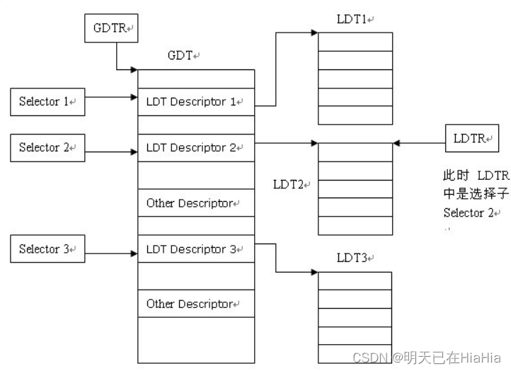 LDTR可以在程序中随时改变,通过使用lldt指令。如上图,如果装载的是Selector 2则LDTR指向的是表LDT2。