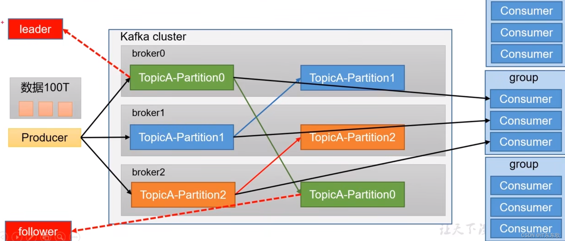 kafka集群:如果数据量大的话,一台服务器存储不了那么多数据,就引入了kafka集群,每个节点存储一部分数据。当然消费者也分组消费,一个消费者只能消费一个分区。