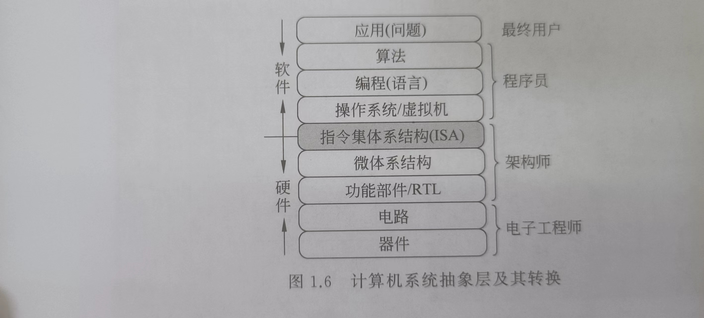 从应用问题到机器语言程序的每次转换所涉及的概念都是属于软件的范畴,而机器语言程序所运行的计算机硬件和软件之间的桥梁就是指令集体系结构(ISA).