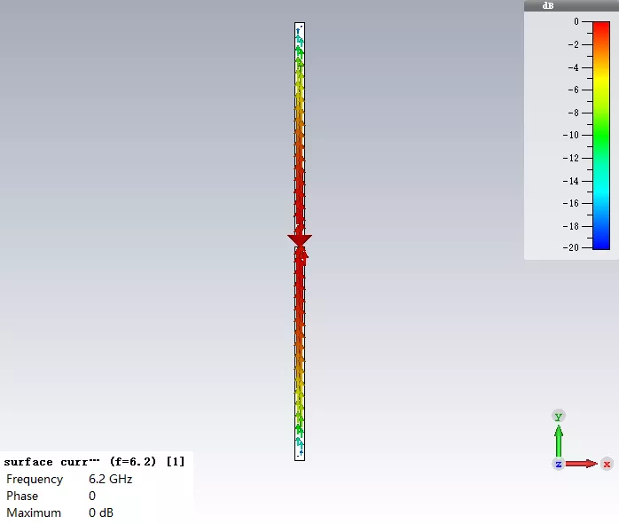 在电路分析中,谐振的定义是输入阻抗虚部为0,即谐振频点落于Smith圆图的纯电阻线上。从CST时域求解器仿真结果可以看出,6.185GHz和19.16GHz两个频点在纯电阻线附近,两者之间还有一个频点靠近开路点。从S11上来看,难以分辨出其属于谐振状态。而在CST积分方程求解器的仿真结果则可以很清晰地看出在定义的仿真频段内,6.392GHz,13.16GHz,20.04GHz三个频点的模式激励系数达到峰值。特征模方法对天线设计具有指导意义:即给定任意结构辐射金属,可以从理论上求解出所有能激励的辐射模式,且各模式之间满足正交性。