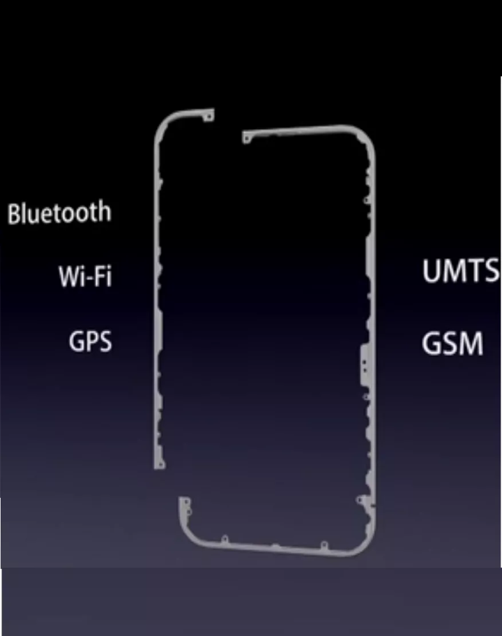 金属中框天线初创于iPhone 4。当年乔布斯富有激情的向我们讲解了iPhone 4手机最伟大的设计之一:独具匠心地利用金属中框充当手机天线。iPhone 4手机的机身四周被两条不锈钢金属所包裹,其巧妙地集成了UMTS、GSM网络和蓝牙、Wi-Fi、GPS的天线。虽然当时苹果公司独具匠心地将iPhone 4的手机天线和边框整合在一起,使得整机一体化,更富有时尚气息,但用户一旦紧握手机,就会导致信号接收质量下降。即便如此,IPhone 4敢于第一个吃螃蟹,也在一定程度上引领了现在旗舰机型的手机天线设计。