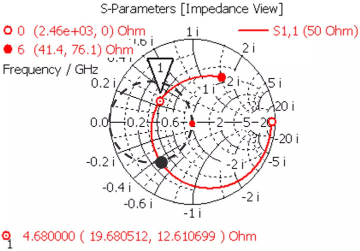 在现如今智能手机的内部空间可谓是“寸土寸金”,小净空下的单极子天线,其Smith圈往往比较靠外,不好匹配。如果按下图所示,在馈电处并联一个小电感,Smith圈就会缩小;除此之外,匹配良好的频点则会偏移到低频(如下图黑色圆所示,并联电感后该点能逆时针挪动到匹配中心),即并联电感能进一步缩小天线尺寸(天线辐射效率可能有一定程度的下降!)。