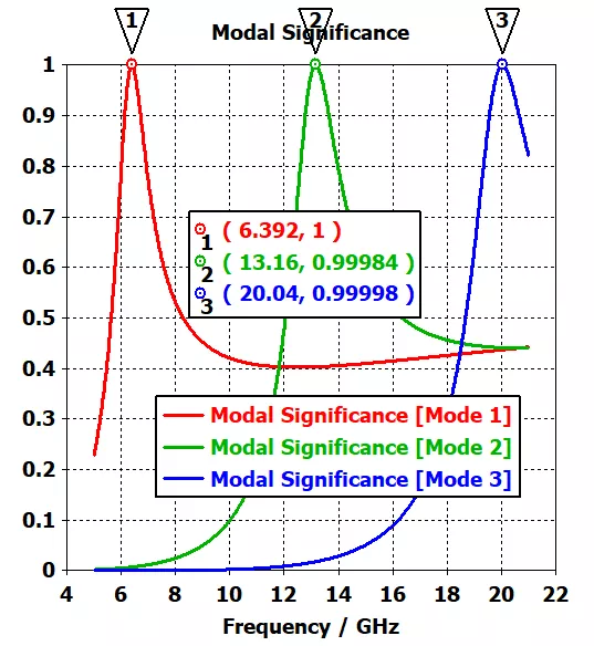 CST积分方程求解器,CMA激励类型:天线在6.392GHz,13.16GHz,20.04GHz三个频点,其模式激励系数达到峰值