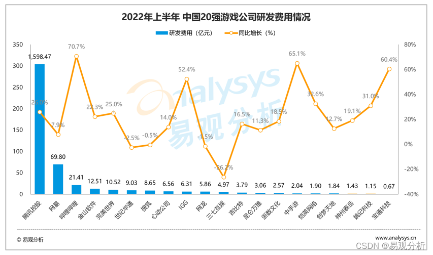 宝通科技、IGG为研发费用同比增长排名第三、四的企业。其中,宝通科技旗下工业领域业务研发投入较高,包括如工业互联网、无人数字化处理等,同时其旗下游戏业务侧重二次元、战争策略类游戏研发,当下自研定制产品共有8款。IGG方面,研发基地、全球研发团队为其主要开销方向,整体来看其研发投入有所缩减,2022上半年为6.31亿元,环比有所下滑。