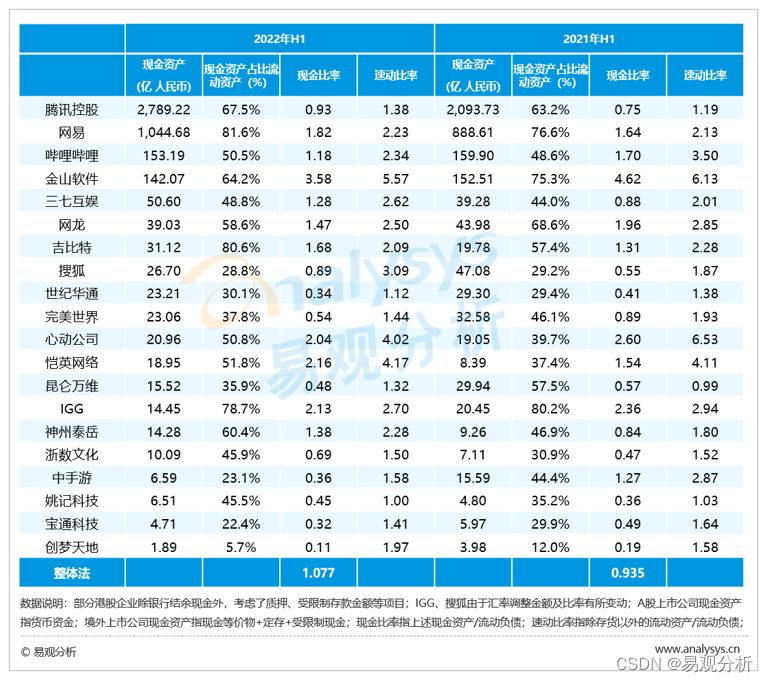 2022上半年中国20强游戏公司现金资产情况及相关短期偿债指标如下: