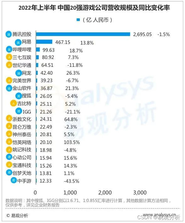 易观分析:2022上半年,国内游戏版号恢复发放、海外新兴市场迅速崛起,游戏行业迎来新转折点,但新游匮乏、买量效果差、投融资事件减少等因素仍持续影响行业发展。关注头部上市游戏企业上半年财务表现,可深入了解行业当下发展态势,为从业者、投资者提供参考。