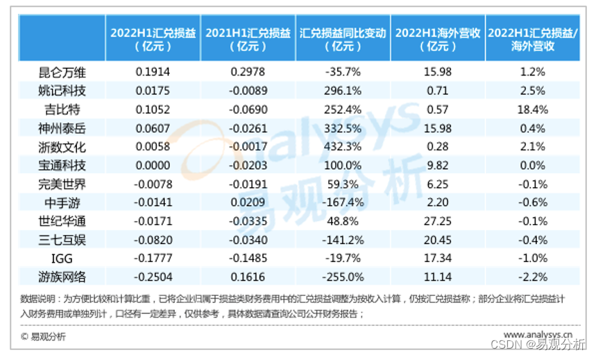表 1-2 2022上半年中国20强游戏公司(部分)汇兑损益情况