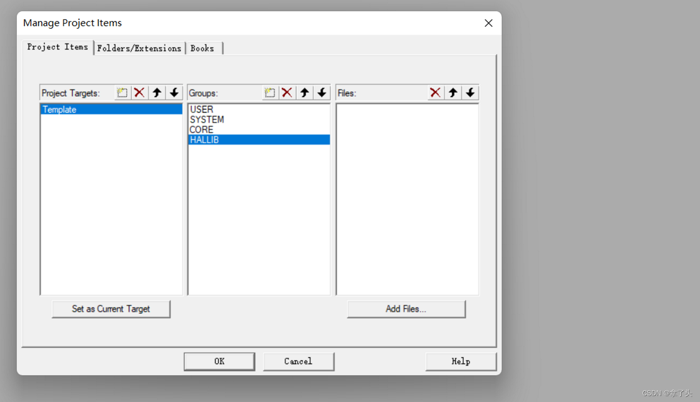 14)我们按照步骤 9 的方法,右键点击点击 Tempate,选择 Manage Project Items.然后选择需要添加文件的 Group,这里第一步我们选择HALLIB,然后点击右边的 Add Files,定位到我们刚才建立的目录\HALLIB\Src 下面,将里面所有的文件选中(Ctrl+A),然后点击 Add,然后 Close.可以看到 Files 列表下面包含我们添加的文件,如下图 :
