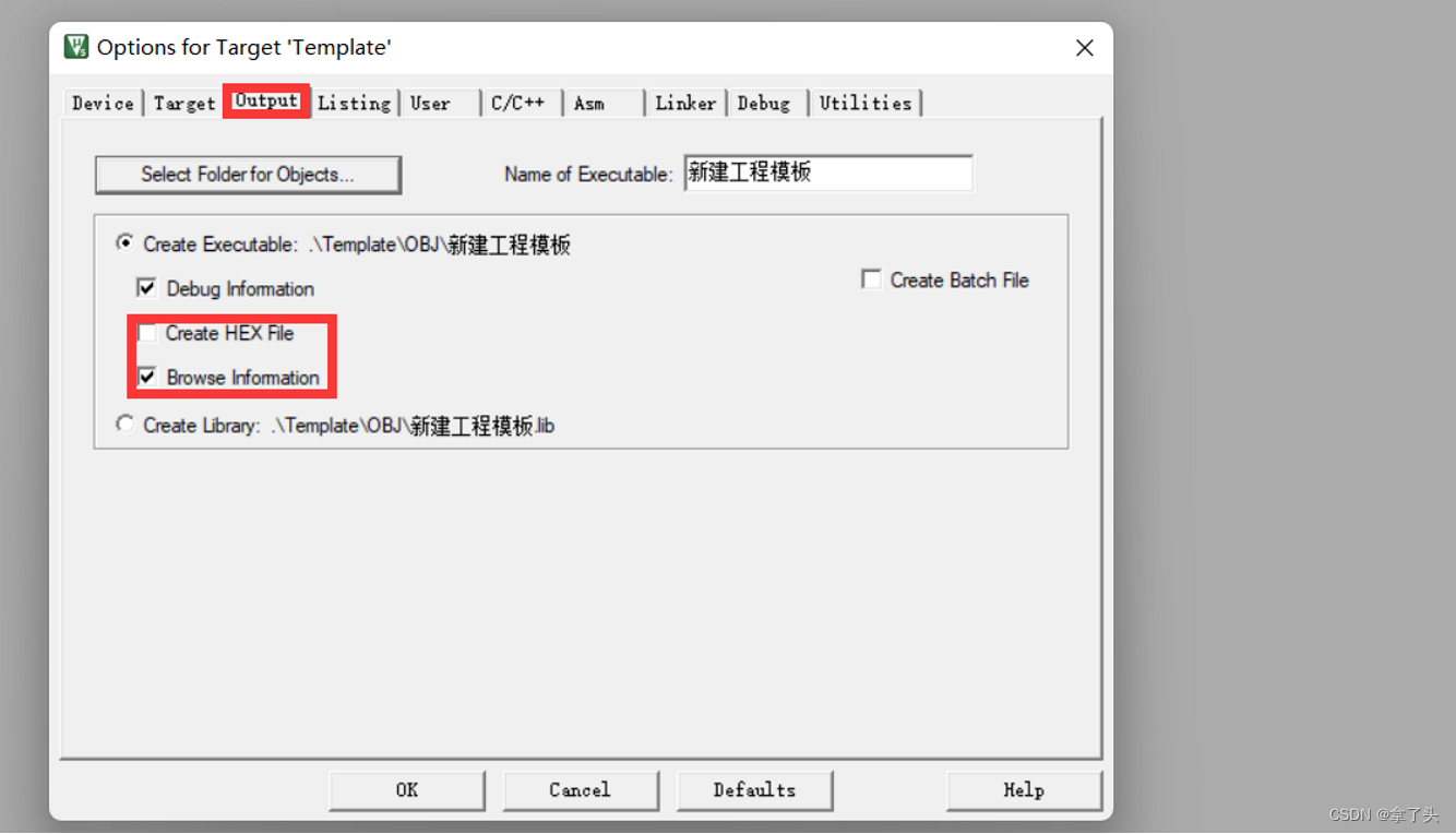要勾上“Create HEX File” 选项和 Browse Information 选项。 Create HEX File 选项选