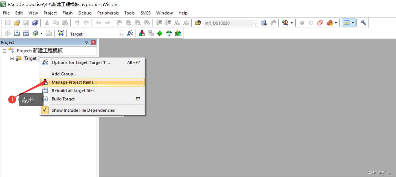 12) 下面我们将前面复制过来的文件加入我们的工程中。右键点击 Target1,选择 Manage ProjectItems,如下图 :