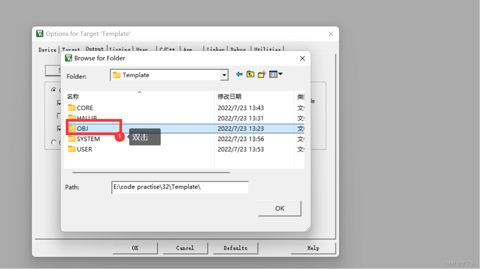 子目录,这里为了和我们 ALIENTEK 工程结构保持一致,我们重新选择存放到目录 OBJ 目录