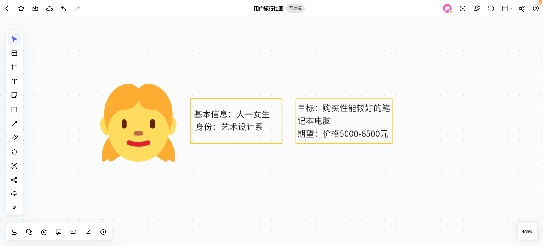 我们可以采用BoardMix博思白板中的女性图像,然后使用矩形框填写用户信息,在线白板工具中可以调节字体大小、颜色以及边框大小与颜色等设置。