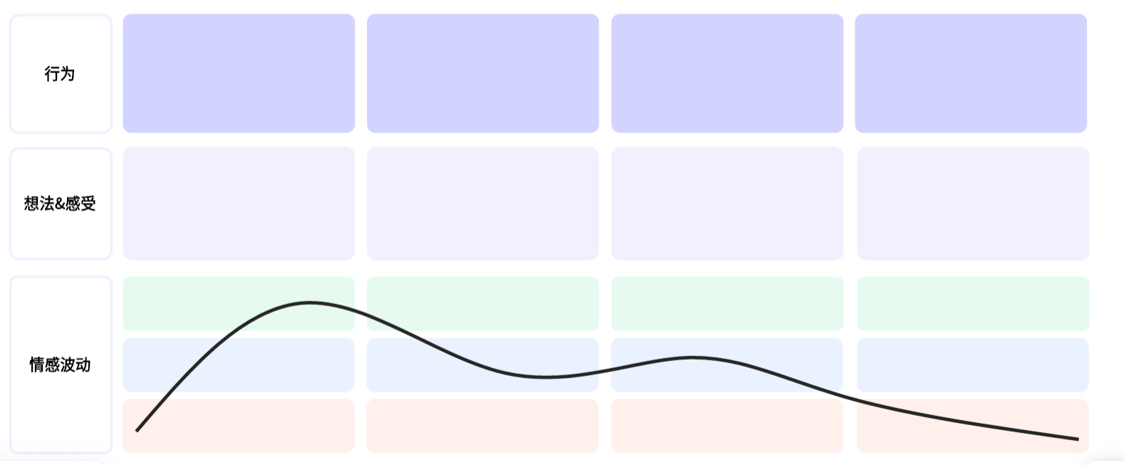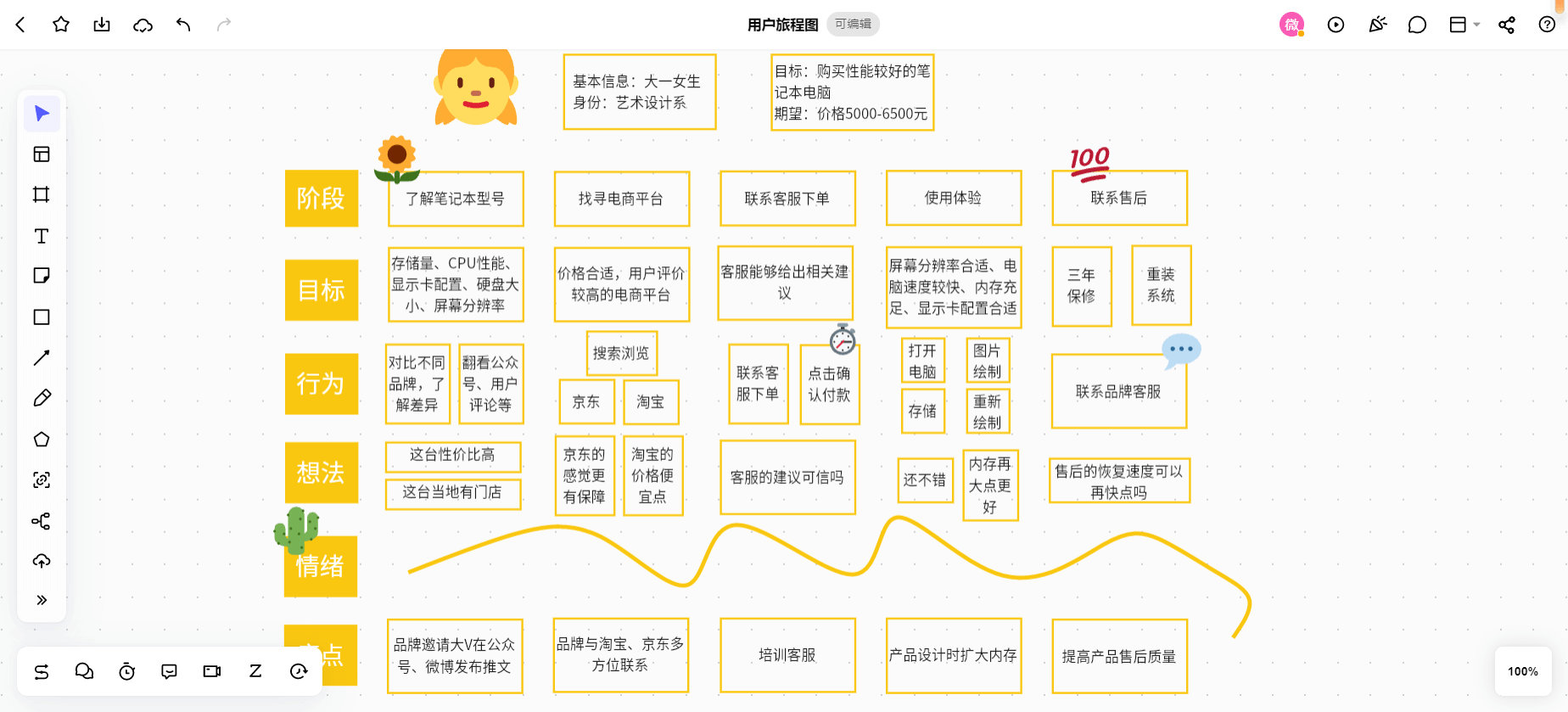 D 猜想用户每一阶段的行为、想法与情绪:顾客每一阶段的行为、想法与情绪与该阶段的顾客目标相一致。情绪曲线可以直接使用BoardMix博思白板中的线段进行绘制,用户可以根据自身需要进行线段曲折设计。