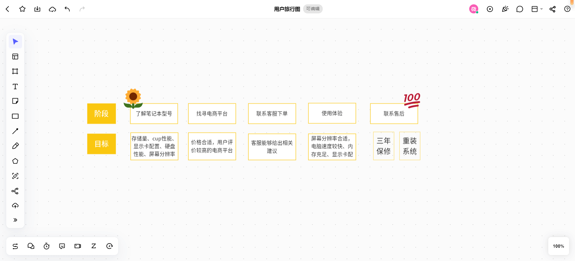 B 划分用户阶段:在“选购一台笔记本电脑”这件事情中,我们可以使用BoardMix博思白板对该名女性用户需要经历的阶段进行划分: