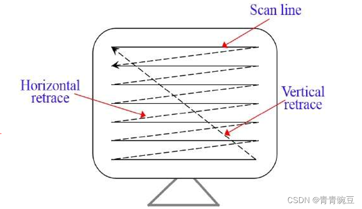 通过控制红绿蓝三基色,就可以控制1个像素的颜色,一幅图像是由非常多的像素组成的。举个例子对于640*480分辨率的图像,是由一行有640个且一共480行,这么多像素组合起来显示的图像,为了让显示器显示这么一幅图像,那么就要控制显示器的扫描枪一个一个像素地将颜色显示起来,像素变化的时间非常快,从而使人眼误认为所有像素是一起显示的。