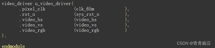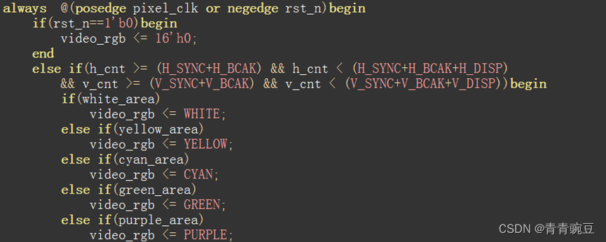 注意到原理图中,对于RGB565成像有5根红基色、6根绿基色、5根蓝基色、行同步和场同步信号与FPGA芯片相连,通过这些信号按照上面说明的行场时序逻辑即可完成通过VGA接口传输各种各样的图像信息,如表6-3所示是video_driver模块的信号列表,在这个模块中我们去实现VGA显示白、黄、青、绿、紫、红、蓝、黑的8种颜色的彩条时序逻辑,如图7所示是VGA驱动模块的代码设计。