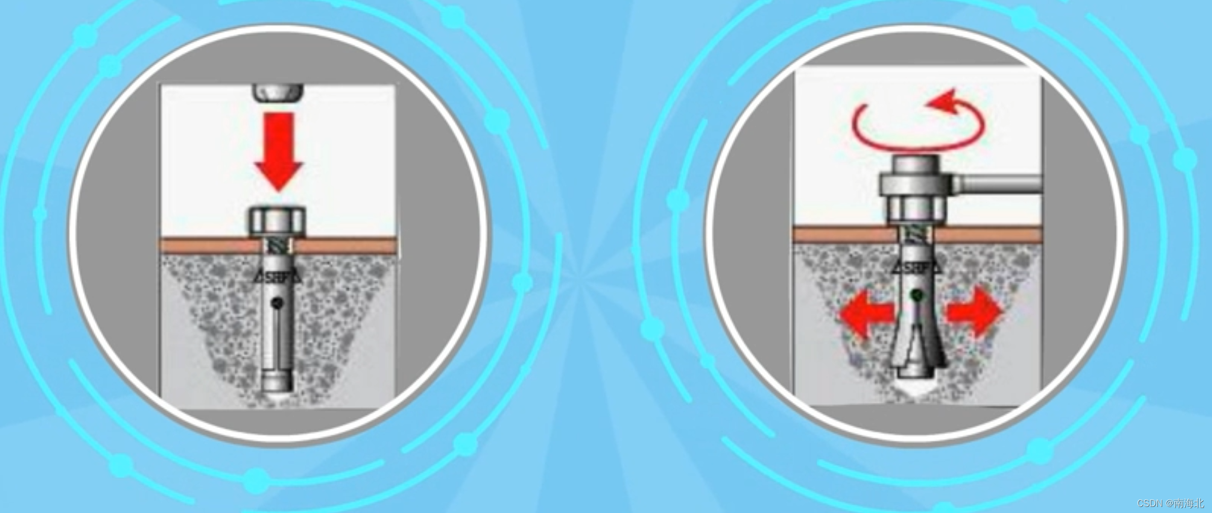 螺钉一头是螺纹,一头有锥度。外面包一铁皮(有的是钢管),铁皮圆筒(钢管)一半有若干切口,把它们一起塞进墙上打好的洞里,然后锁螺母,螺母把螺钉往外拉,将锥度拉入铁皮圆筒,铁皮圆筒被涨开,于是紧紧固定在墙上