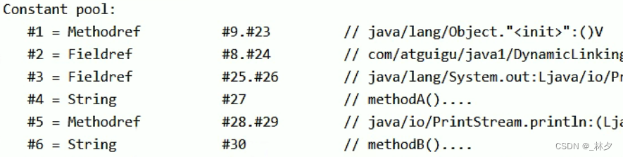 在字节码文件中,所有的变量和方法引用都作为符号引用(#6)保存在class文件的常量池里。一个方法调用另一个方法时就是通过常量池中指向方法的符号来表示。动态链接的作用就是为了将这些符号引用转换为调用方法的直接引用。