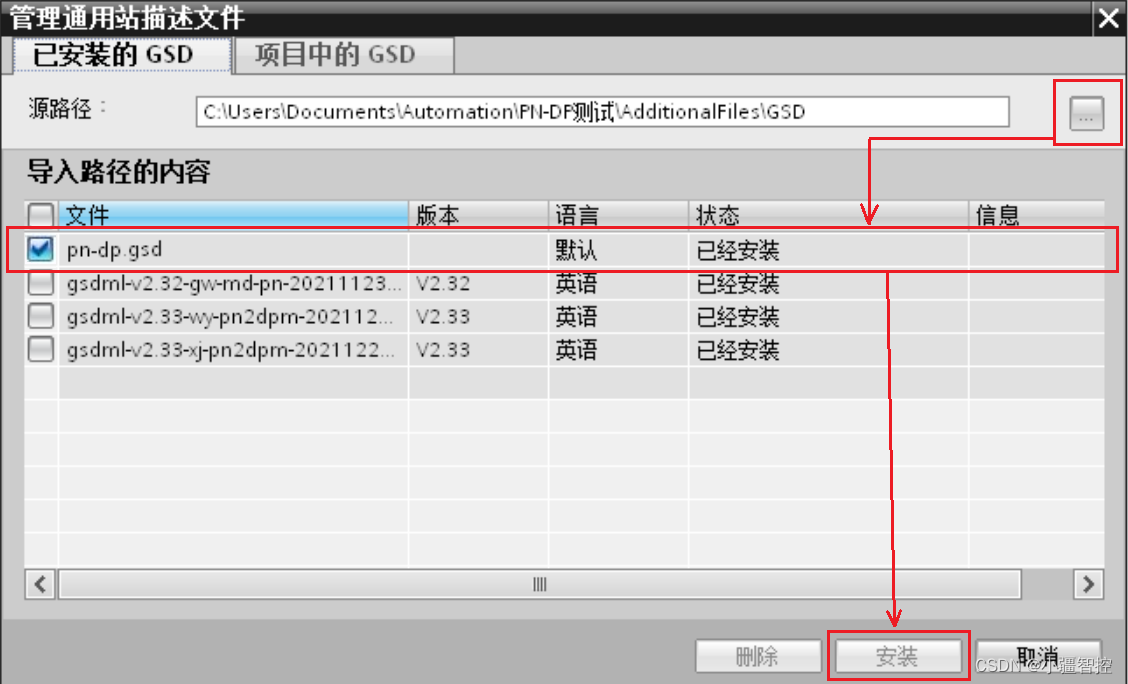 1、浏览GSD所在文件夹(GSD文件夹不要是中文),添加PROFIBUS转PROFINET网关的GSD文件到博图;