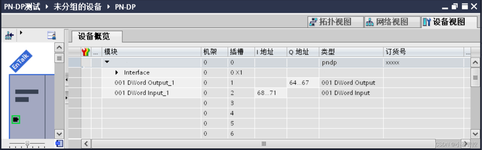 3、双击PROFIBUS转PROFINET网关进入设备视图,设置所需要的输入输出字节数长度;