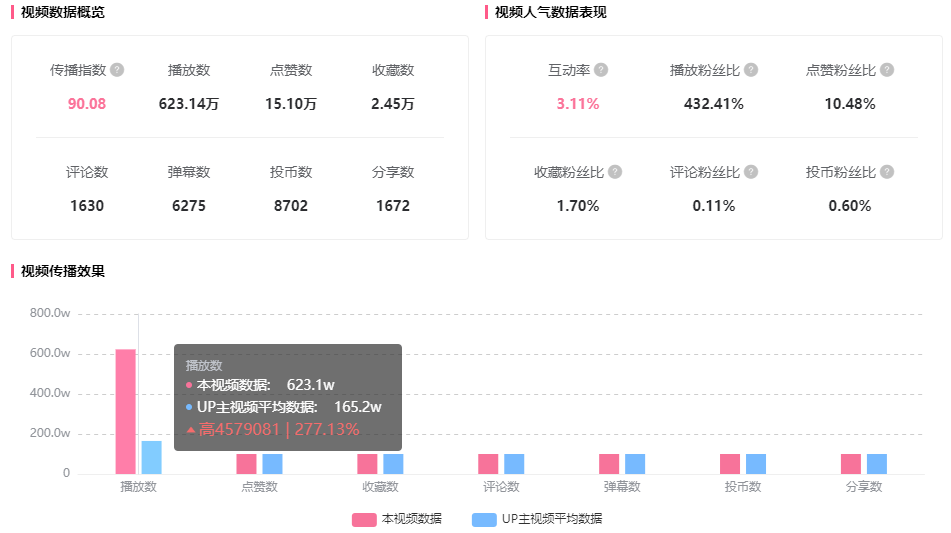 而这支作品也成为UP主少有的爆款视频之一,传播指数高达90,播放量超623w,播粉比更是超4倍增长,视频传播水平远比UP主平均水平高出277.13%,推广视频得到高曝光,推广产品露出加上评论区蓝链带货不仅刺激目标用户消费,品牌也在B站收获高声量。