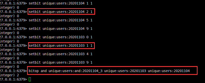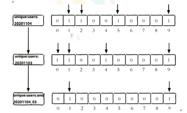 bitop and unique:users:and:20201104_3(两个时间都访问的) unique:users:20201103(3号访问的) unique:users:20201104(4号访问的)