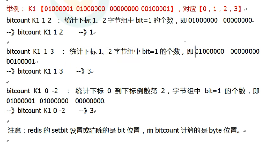bitcount 键 start end :统计字符串(把它转化成对应的字节,比如abc代表三个字节,转为ascll为97 98 99,再转为8位的二进制...)从start到end中bit为1的数量