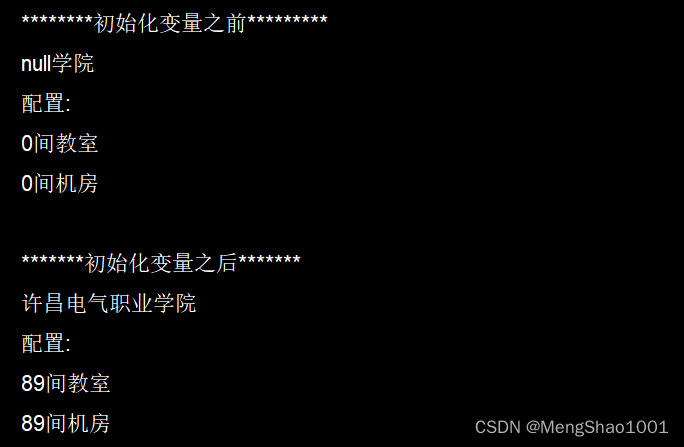 System.out.println(schoolName+"学院\n"+"配置:\n"+classNumber+"间教室\n"+labNumber+"间机房\n");