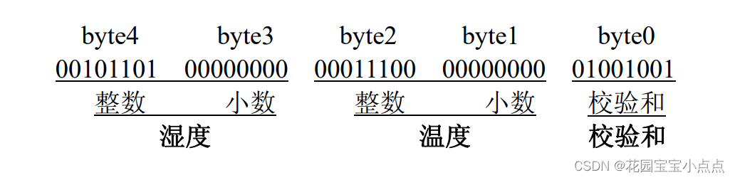 数据格式:8bit湿度整数数据+8bit湿度小数数据+8bit温度整数数据+8bit温度小数数据+8bit校验和。